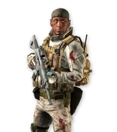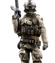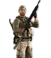 На нем шлем MICH 2001, с баллистическими очками в чехле. Активные наушники от 3M, Peltor Comtac 3. Арафатка на шее. Рубашка милитари покроя которая меняется цветом при выборе другого камуфляжа. Неопознанный плитоносец с подсумками для магазинов пулемета. Подсумок для пистолета на груди. Болторез покрытый камуфляжной лентой закрепленный на рюкзаке. Набедренный подумок для магазина пулемета. На лодыжках гетры от неизвестного производителя.