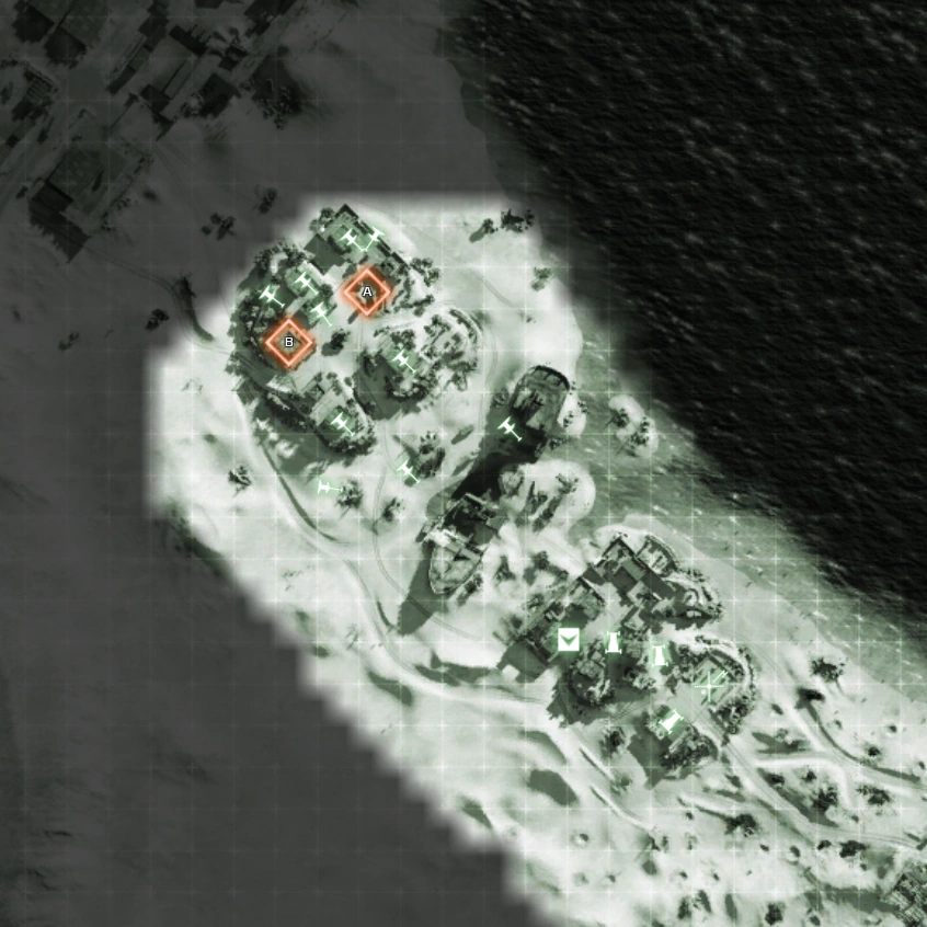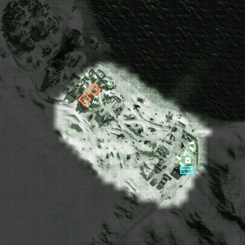 The Russian attackers will have 2 Quad Bikes, one Cobra 4WD, one Mil Mi-24 Hind and one UAV-1 at their disposal once the 2 M-COM Stations have been destroyed. This base will be conserved for the attackers' use until the 2 M-COM stations at the Western Island have been destroyed.