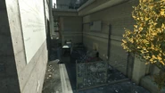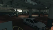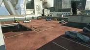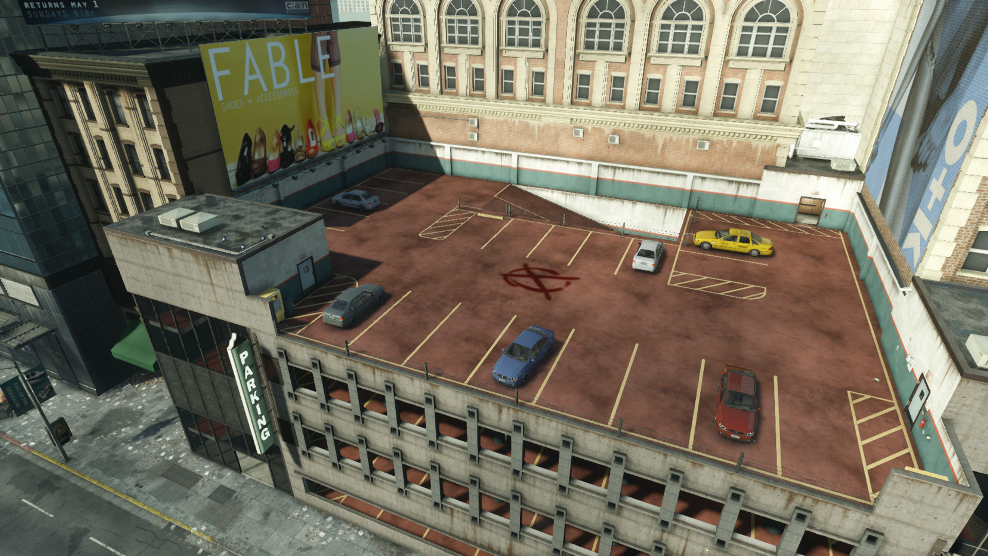 The Parking Garage flag is on the third floor of a four-story parking garage on the northern side of the map. The capture zone is confined within the close quarters of the car park interior, with few routes up to the third floor. Two stairwells can be found on the east and west side of the car park, in addition to vehicle ramps leading up from the ground floor on the northern wall of the building. An elevator on the ground floor can also be used to attack the flag from above, as it stops on the top floor of the car park. Due to its location between two buildings, players in the garage are generally only exposed to long distance fire from the bank windows and roof parallel. Inside the capture zone, the limited amount of cover takes the form of parked cars and bullet-resistant but very thin concrete support pillars.