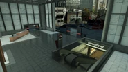 The Bank flag is located on the ground floor of the two story bank interior, with the capture zone extending to the offices and tellers counters on the south side of the lobby, in front of the vault entrance. Due to the constricted nature of this section of the bank interior, the fight for the flag is decisively close quarters, with the few narrow routes to the capture zone acting as choke points for attackers. On the west side, the approach to the capture point is through the exposed entrance lobby, and through a small archway that is similarly vulnerable to fire. The several doorways into the teller's offices on the north side are fortified with bulletproof glass, meaning players must enter the office itself to engage enemies inside the capture zone. Holes blasted through the vault allow players to reach the flag using the vault door, however the capture zone does not extend to the well protected vault interior. Finally, a corridor leading from the loading dock to the east provides the last avenue of assault. In addition to the already restricted nature of the flag, a button in the security room can be used to block access to the vault door from the offices and teller counters, however this is limited in usefulness as the flag can be seized from either of those positions.