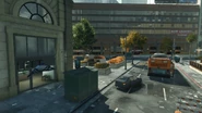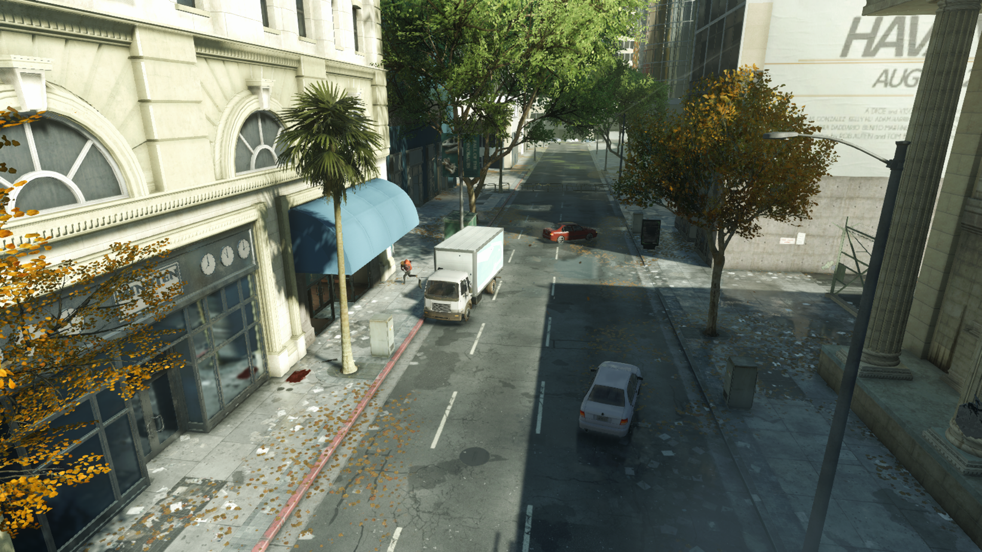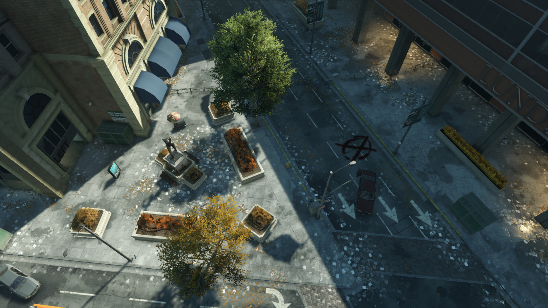 Escape point C is in the Plaza south of the bank, across the street from the Restaurant. A kitchen escape is the most direct method for reaching this extraction, with the planters and decorative fittings of the park providing cover for a criminal team on the verge of escape. As this point is the furthest from the SWAT spawn and closest to that of the Thieves', this can be generally considered the path of least resistance during a Heist.