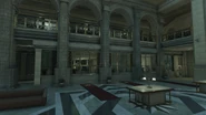 The map boundaries on Bank Job generally restrict movement to the bank interior, although portions of the side streets, and the entirety of the parking garage, are available for use. The SWAT spawn outside the main entrance of the bank, while the Thieves start near the hostages on the second floor of the rectangular lobby to the eastern back of the building. Hostage 1 is in the conference room at the top of the stairs in that lobby, while Hostage 2 is confined to the meeting room on the southern landing. The extraction point is a police cruiser next to the subway entrance, directly north of the SWAT team's deployment point.