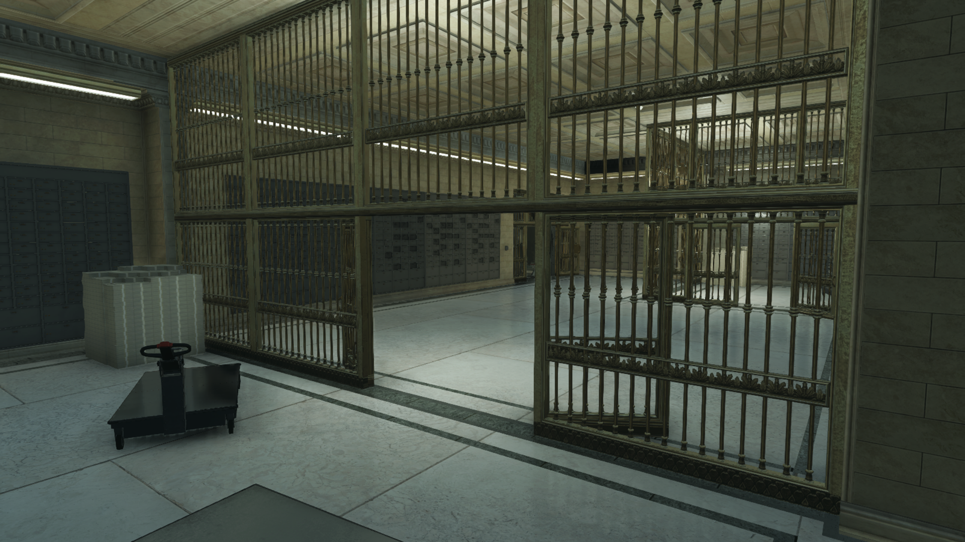 - A button in the security room on the other side of the corridor from the vault can be used to lock several gates shut in the bank interior. These gates cannot be destroyed using explosives or the breaching hammer, and so severely limit access to the vault.