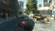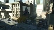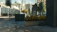 Flag C is situated on the south end of the map, within a small plaza with several stone planters and a chrome statue. Although the shoulder high planters provided decent line of sight breakers, the lack of all-round cover in this area means it is vulnerable to attack from above, as the flag is overlooked by the bank roof. The surrounding streets are similarly exposed, with nothing but stationary cars and news kiosks for protection. Overhead protection can be sought within a small shop directly east of the flag, a parked bus in the north side street, and a shopping front with stone pillars to the west. All of these cover points exist outside the capture point however, making the flag difficult to capture.