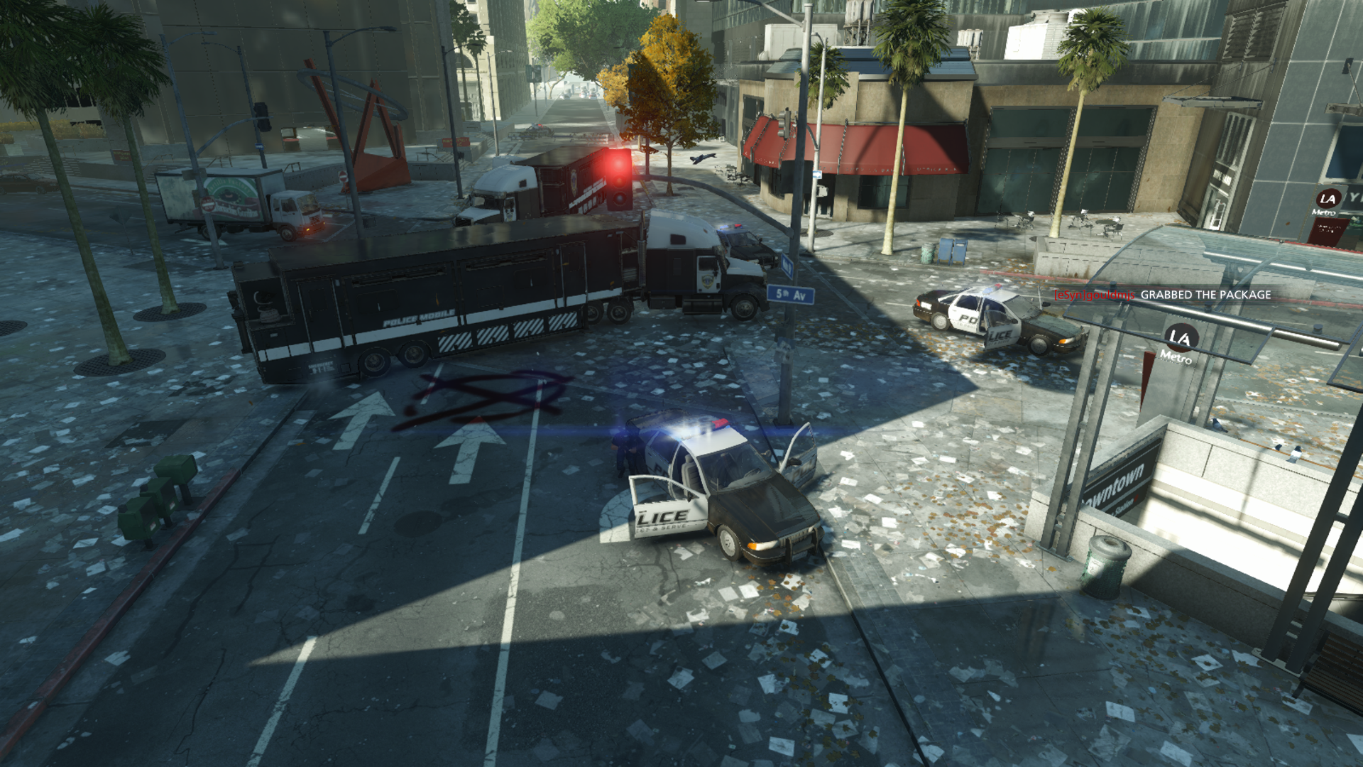 Escape point B is the police cordon outside the bank's main entrance. The most direct escape route is through vault door and pushing out into the lobby, allowing bag carriers to reach extraction within seconds. However, the location is also seconds from the SWAT's primary spawn point, although it is blocked from direct line of sight via a parked Police Command truck. Breaking through the police barricade can be tough should a protracted shootout take place. The bank rooftop, the doorway of the lobby, a newspaper kiosk and the sides of the command truck yield directional cover positions for Thieves to hold back the police reinforcements with support fire while a runner makes a dash through the crossfire to the getaway vehicle.