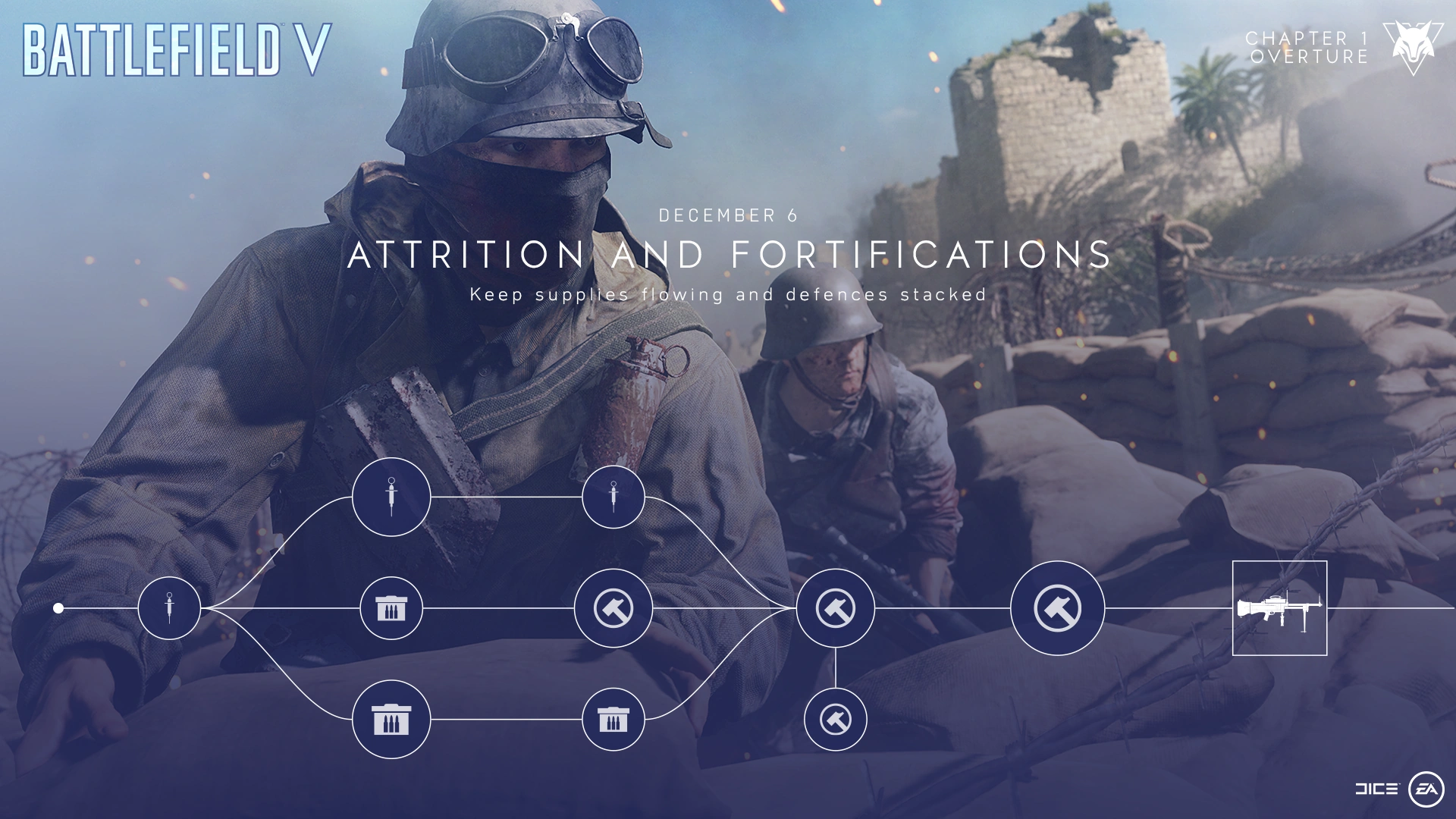 | Fortify Defenses | Controlling the flow of battle can give teams a distinct advantage. With the build tool equipped you may build fortifications to provide cover and control routes around objectives in designated areas. Support class players have the ability to construct fortifications more quickly and have more fortification types available than other classes. |