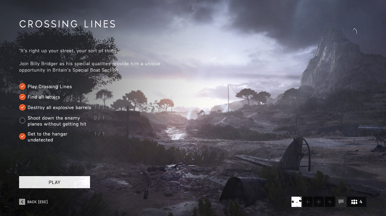 Challenges are an optional gameplay feature of the singleplayer War Stories of Battlefield V. Each chapter of a War Story features challenges with specific tasks to complete through multiple playthroughs. A challenge will automatically save when its requirement is met and does not necessarily require the completion of that respective chapter.