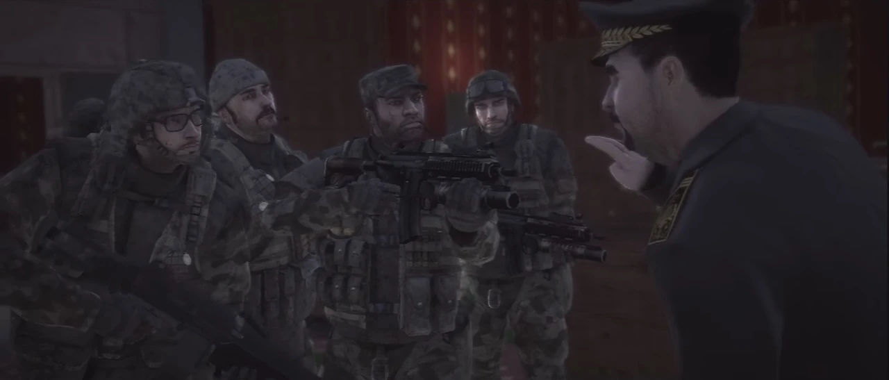 Bravo-One defeats most of the mercenaries in the harbor, clearing a path to the cargo ship. As they make their way to the ship, however, they are ordered to drop their weapons and surrender or be taken by force as a small convoy of US Army HMMWVs arrive. Haggard taunts the convoy, shouting "Oh yeah? You and what army?", much to the confusion of Sweetwater. Redford then tells Haggard to shut up and look around as the convoy's "army" arrives: a trio of AH-64 Apaches. Left with little option, the squad surrenders and is taken into the Army's custody.