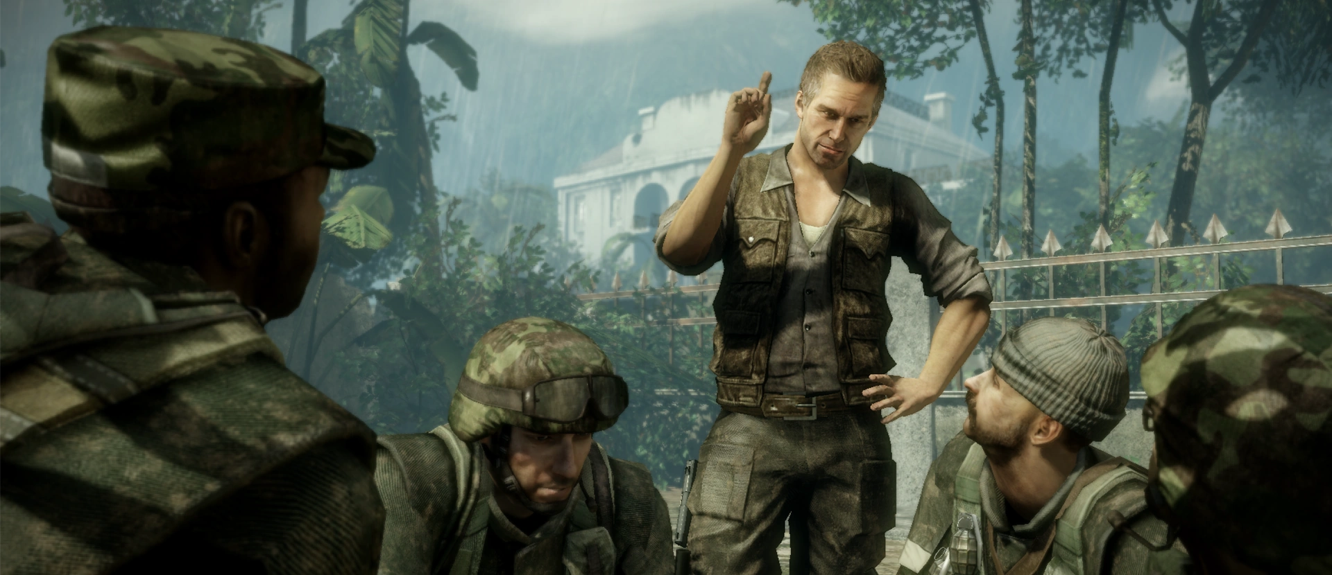 Bravo Two eventually manage to catch up to Aguire's escort detail at an old plantation manor within the jungle. The LAM was intending to hand off Aguire to the Russians here, and as a result the squad encounters Russian infantry as well as a BMD-3 at the manor. Defeating the IFV, Marlowe manages to save Aguire from being loaded onto a Russian Hind by killing the soldiers holding him hostage. Aguire then proceeds to save the Sweetwater from a Russian soldier sneaking up on the squad, and determines that they're "even" for rescuing him.