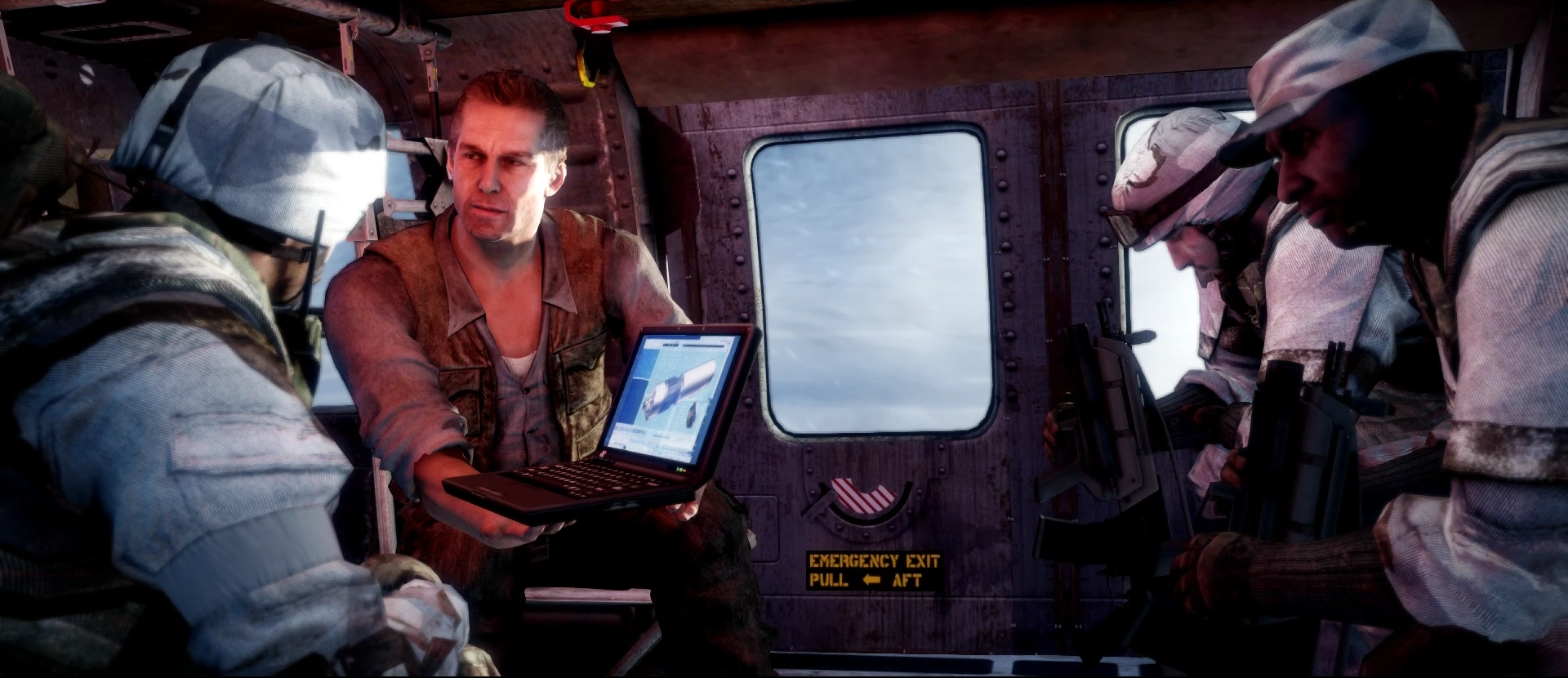Redford gives Aguire the USB stick, who looks through the files on a laptop and is unsurprised by the existence of the dummy weapon. Aguire is mostly angry with command, as he had already told them the real weapon wouldn't be at the Chukota drop, which is news to the squad who were mostly in the dark regarding the weapon.