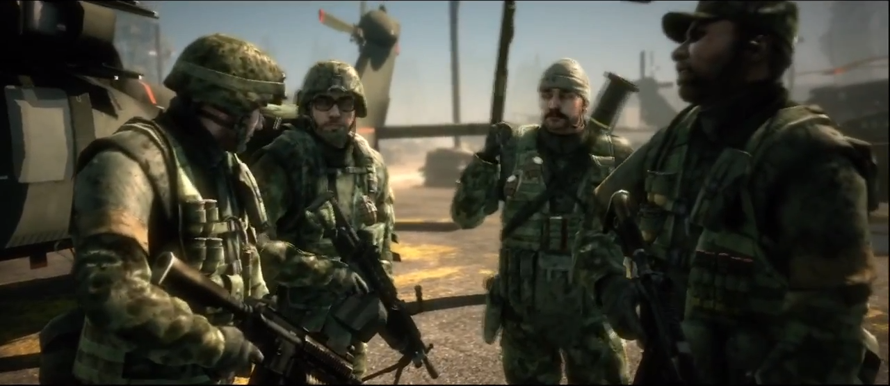 A very early draft for Bad Company 2 released by David Goldfarb, the game's writer and lead designer, has the squad spending their gold on beachside homes and, in Haggard's case, oversized golden jewelry. The group is eventually tracked down by Army Military Police, however, and are detained. The squad is then stationed at a checkpoint somewhere in the Caucasus Mountains as punishment.[7] As the draft was created in 2008 and differs significantly from the opening of the final game, these events are likely non-canon in the Bad Company timeline.