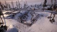 The Hilltop Battery is adjacent to the rail line in the map's southern sector, atop a hill overlooking the town and the Rail Pit to the west. The capture zone itself consists of an artillery dugout with a number of unusable field guns in firing position, although the area itself is surrounded by a trench network around the perimeter of the plateau. Pine trees dot the slopes, and along with a few scattered boulders, make up the majority of cover along the objective's approaches. Athough this flag is equidistant from Bercheza Bridge as the Supply Depot, Hilltop Battery is somewhat isolated in its position up a steep hill from the valley objectives. A mountain trail leads north-east towards the Samara River objective.