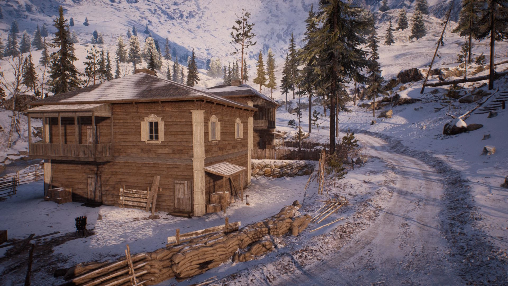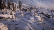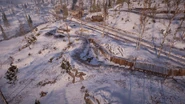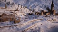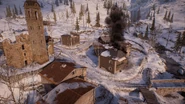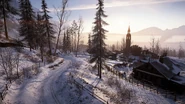 Combat on Brusilov Keep takes place along the eastern slope of a snow-capped mountain, which houses the small town of Kolomea, itself comprised of several dozen buildings of wood and stone. The town is situated at the junction of the Samara River, which flows downhill across the width of the map, forming a shallow valley that splits the settlement into two. On the East Bank of the river are a series of fortifications on the outskirts of town, as well as a cluster of buildings closer to the bank itself. The West Bank contains the larger half of the settlement, with the key feature being a conspicuous bell tower that overlooks much of the riverside area, including a view straight down Bercheza Bridge, one of three such bridges that span the valley floor. Other features of the area include a rail line and main road, that run vertically across the western edge of the slope, initially parallel to one another before branching at the river.