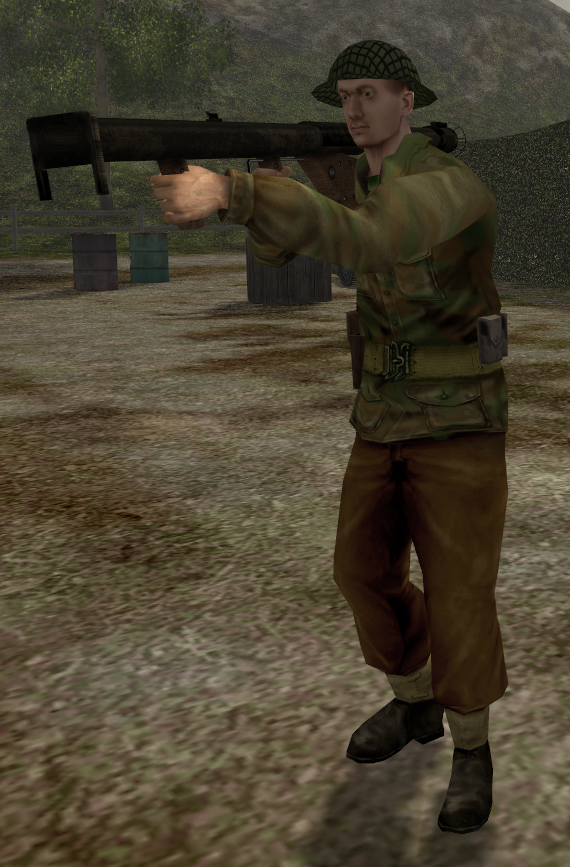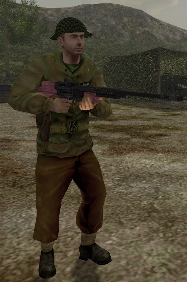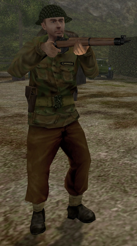 The Canadian Army is similar to their British counterparts in terms of appearance, sporting the Brodie helmet (albeit with an additional net cover) along with British backpacks and webgear. They wear camouflaged Denison smocks with "Canada" emblazoned above their left chest pocket, and brown pants with black boots. Medics do not have the large red cross, and Scouts do not have camouflage on their helmets.