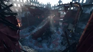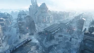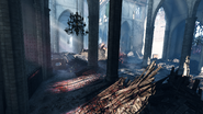 The main landmark on Devastation is the Cathedral, located in the direct center of the cityscape. It is by far the largest structure on the map at over 100m length, although the capture zone only encompasses the middle section of the vast interior. The main chamber is divided by great ridges of timber formed from fallen section of the roof, which divides up the space inside the Cathedral considerably. Although these debris piles and the exterior walls are indestructible, there are a large number of entryways into the capture zone. The main entrance is on the east side, with double doors opening into a small lobby, the Narthex, located directly underneath the shattered belltower. Nearby are two enclosed staircases up to a balcony for the Cathedral's massive pipe organ, which can also be reached using a collapsed section of roof to the north - the balcony can be used to defend both the entry lobby and the main chamber from on high. Within said main chamber, there are seven possibly entry points - three on the north side, three on the south, and one large opening to the west.