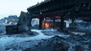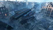 Train Wreck is found along the western edge of the main play area, close to the German deployment. The elevated train line cutting across that side of the map has been severed by the bombardment, derailing the burned out passenger carriages and scattering them across the adjacent roadway. A large bridged section of the track has collapsed in the middle of the capture zone, leaving an open area. Underneath the remaining structure to the north, fallen track parts and wrecked train cars form a closed off, tunnel-like zone in which there is little cover along its axis. Players can hide behind pillars, in the upturned burning carriages, or behind sandbag walls constructed underneath the bridge using Fortifications. On the north side is the only reachable section of upper platform as the line forms a sort of ramp, granting an elevated position against the surrounding lower ground.