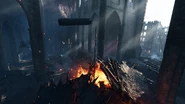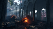 The central flag of Cathedral has a capture zone similar to Conquest, concentrated within the rubble pile in the transcept between the north and south entrances. The rubble initially prevents teams from seeing each other directly as they pile into the capture zone, with combat consisting of securing flanking routes or engaging from unexpected angles. This can be from the narthex, the upper balcony around the pipe organ or, exclusive to this mode, through may of the church windows due to the addition of scaffolding on the outside.