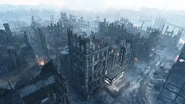 A large bombing raid has pounded Rotterdam, transforming the formerly vibrant and scenic city into an ashen gray ruin. Rubble from collapsed buildings has spilled over the streets creating ridges out of once even ground, forming impassible barriers, or allowing for new routes through holes in some of the buildings opened up by the bombings. The city's other recognisable landmarks have been similarly ravaged, with the elevated train line severed, canals filled in with debris, and tramways buried. Virtually no building has been left untouched; some are left as metal skeletons, others as charred husks, and the rest uniformly roofless or with tattered facades. Large structures on the periphery such as the Library and Cinema are only partially recognisable. The main icon of the map, the Cathedral, has survived but has sustained significant damage.
