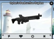 Dylan's Destructive Duplex is a machine gun available in Battlefield Heroes for the National Army. It was introduced on December 16, 2011 in the Christmas 2011 bundle. Unlike other machine guns, it also features a grenade launcher as an alternate fire attachment. Its counterpart for the Royal Army is Max's Magnified MG and is statistically identical.