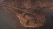 Sunwada Redoubt is along the south coast of the second, larger island of the map, accessible from the south and west (Turtle Hill and Marsh Village, respectively) by shallow fording points marked with wooden poles and duckboards. Light fortifications have been constructed around a short hillock raised up from the shoreline, in place to defend against the south and southwestern approaches. Further inland is a rocky mound that forms a sort of high ground over the position, granting additional directional cover to the northwest and blocking sightlines from the capture zone of Sunwada and Marsh Village. The mound, as well as a set of gullies on the northeast side of the area, can also be used to shelter from seaborne attack. Much of the area lies incorrigibly vulnerable to fire from the high walls of the fortress on the opposite end of the island.