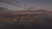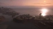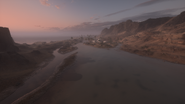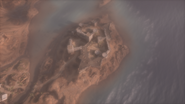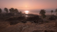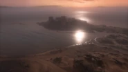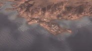 The Shatt al Arab Post is found on a small, circular speck of land along the coastline to the map's north. This low-lying area is surrounded by water, with the sea to the east and swampy marshland to the west. Narrow land bridges carrying the road connect the area to the adjacent landmasses. The post consists of rudimentary fighting positions constructed of low sandbag walls, intended to defend the objective to the north, east and south. The west section of the island, facing the marshes, is made up of an earthen mound topped with boulders, and remains as the only solid and considerable cover position on an otherwise highly indefensible point, although a low cliff where the sea meets the shore can be used as a possible hiding spot. The area is watched over by tall cliffs to the north and west, further highlighting its vulnerability.