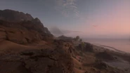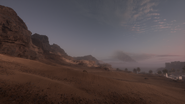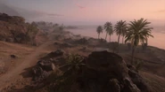 The Al Faw Battery is situated on a high plateau on the western edge of the map center. Of the several rocky ridges that partition the dunes leading up from the sea, the one that seats the objective is made more accessible by a dirt road that passes through the flag, ramping up to the plateau to the north and south. The battery consists of an artillery shelter constructed onto the cliff edge, including three inoperable howitzers, an accompanying pile of empty shell hulks, and a shallow bay trench covered with camouflage netting. The high ground is useful for gaining sight over the adjacent lower areas and ridges, but the position is itself overlooked by even taller cliffs further west. Line of sight to the plateau from the low ground is obscured by the wide rim of the battery ridge, requiring players to scale the heights in order to get a shot into the position.