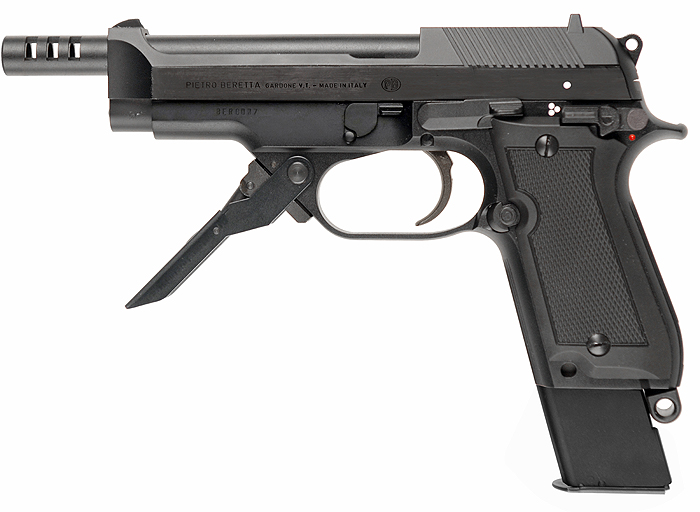 A pistol is a handgun with a chamber that is integral with the barrel, as opposed to a standard (single-barrel) revolver. They utilize the same cartridges as Submachine Guns.