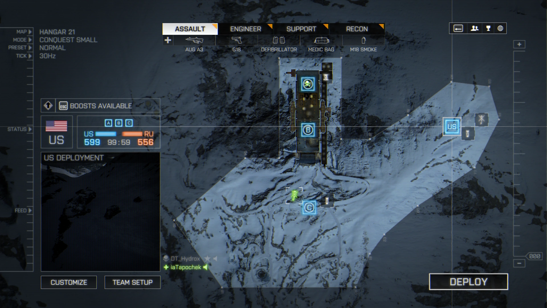 Defuse takes place around the Titan hangar at the top of the mountain. The US team spawns with the bomb outside the vehicle tunnel in the south-east corner of the map boundaries, while the defending Russian team spawns on the third-floor catwalk at the very back of the hangar, along the north wall of the main chamber.