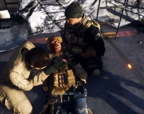 Olsen argues as to why Tex was ordered to leave, as they would then be unable to be extracted. Kovic retorts that if Tex was shot down, he would not be able to call for help and they truly would be trapped. Olsen then responds angrily, stating the Kovic led them into an ambush and that Kovic can "go fuck himself" as he gets his remaining men out alive. Kovic then lunges at Olsen for his insubordination, only for Olsen to kick him in the crotch, making Kovic fall over in the snow. As Tex returns, his Sea Hawk mysteriously crashes and explodes, forcing Kovic to cover Olsen, Price, and Faulkner from the ensuing explosion with his body.
