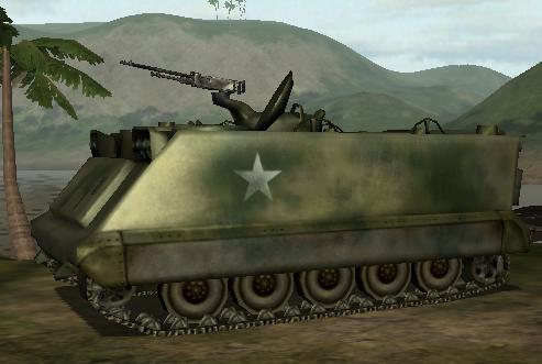 The M-113 is operated by US and ARVN forces in Battlefield Vietnam. It can seat up to six people: 1 driver, 1 gunner and 4 passengers. It's amphibious and well armored but the gunner and driver are exposed, and its only armament is a single M2 Browning machine gun which overheats after extended firing.