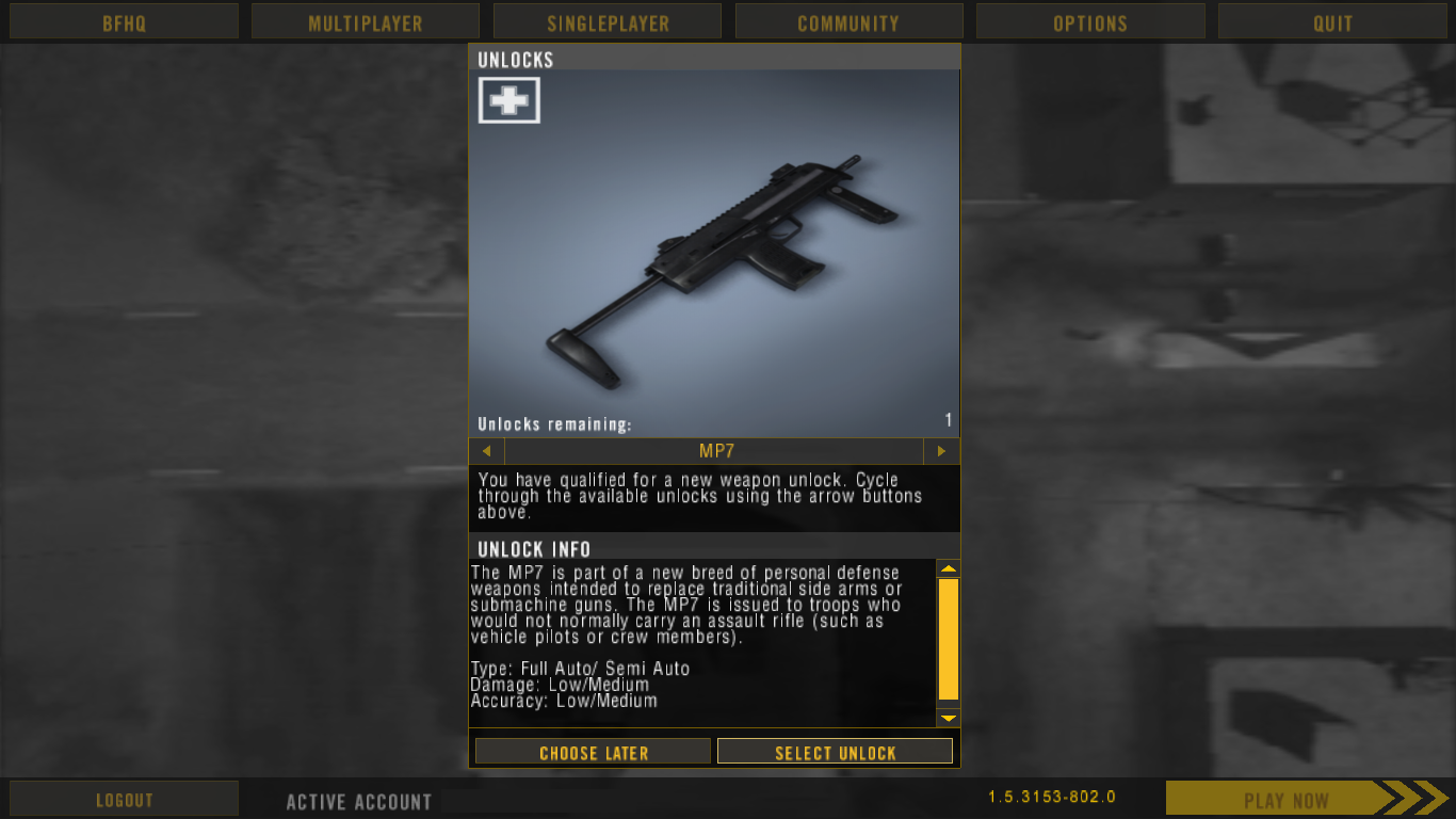 When the weapon is unlocked, the top left-hand corner of the unlock image shows the icon of the Medic kit rather than the Engineer kit. The image with the erroneous icon can be found in mods\bf2\Objects\Weapons\Handheld\sasrif_mp7\info\unlockIcon.png. An image with the Engineer icon can be found in the folder of Battlefield 2: Special Forces, in mods\xpack\Menu_client.zip\External\FlashMenu\images\objects\Weapons\Handheld\sasrif_mp7\info\unlockIcon.png, but is not seen in the game.