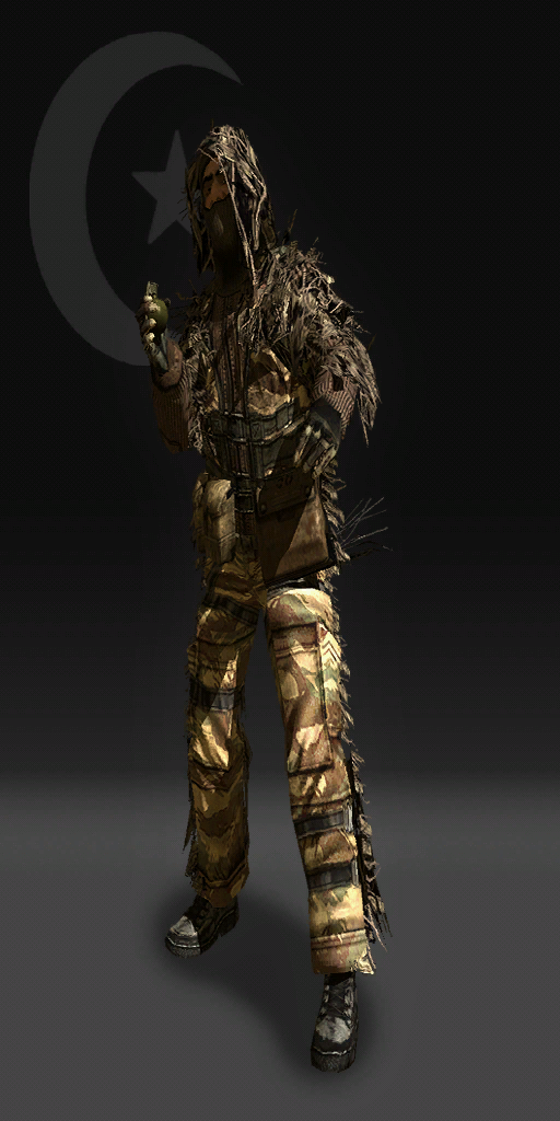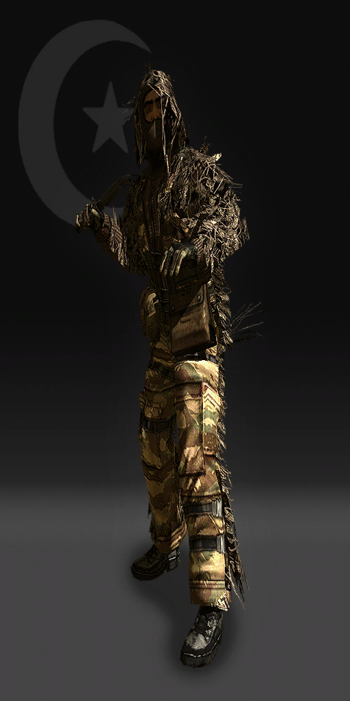 The MEC forces use a variety of weapons from Russia, as well as equipment used by Europeans. The MEC predominantly wear desert camouflage uniforms. Kits with body armor wear helmets and black vest, Engineer kits wear beanies, the Special Forces kit wears a green beret, and the Sniper kit wears a ghillie suit.