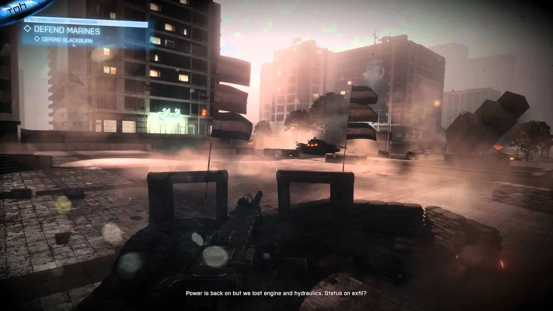 Along the way, they were ambushed by PLR after stopping due to blockage on the highway. While Haymaker's Marines took the attention of the ambushers, Misfit moved in and flanked them. Misfit continued towards the bank on foot, engaging PLR on the street. Along the way, a T-90 tank ambushes Misfit, who flee by moving through a trench into a building. The tank fired at the building, knocking most of Misfit off their feet. After lighting a flare and reorienting themselves, Misfit traversed through the building. Once outside, they witnessed the same T-90 firing upon Haymaker, with the bank in the distance. Once the tank was destroyed by a Javelin team, Misfit crossed the street to find the team had been flanked and killed by the PLR. After engaging them, Blackburn picks up a Javelin and destroys several PLR tanks.