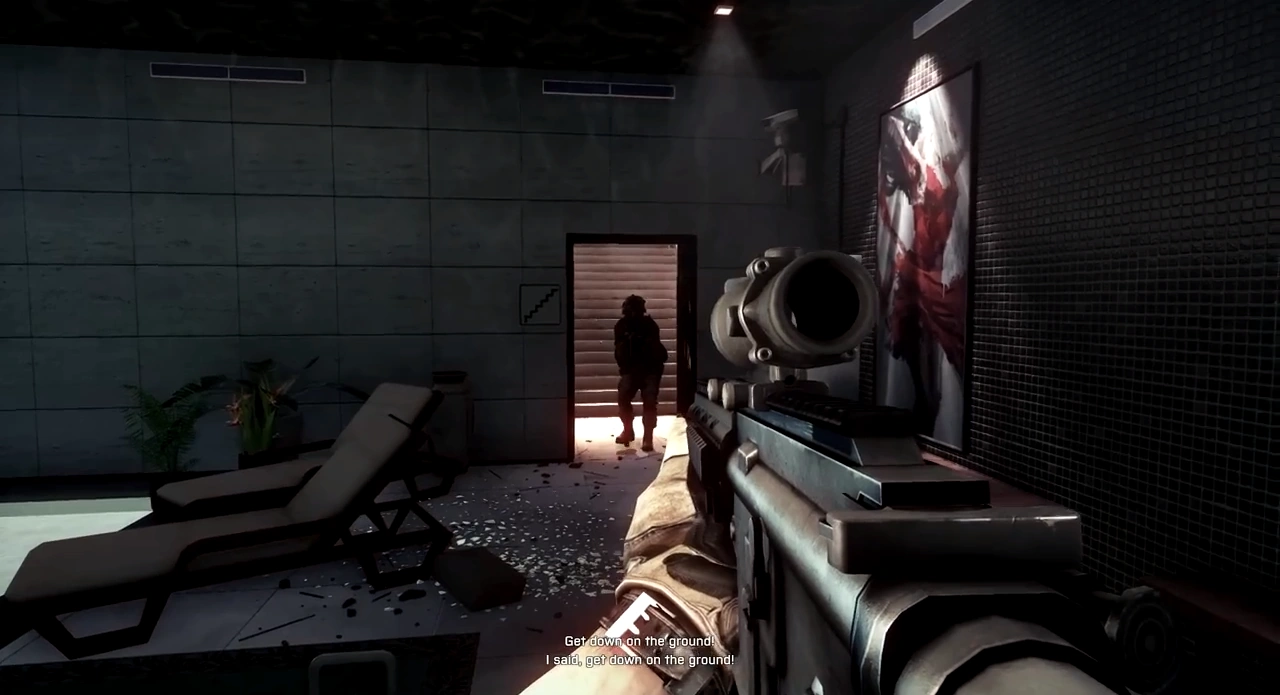 They continued through the tight space, avoiding large gaps. The two overheard a conversation between a group of PLR regarding that Al-Bashir is in the neighborhood meeting with commanders. Blackburn climbs up to ground-level, and engages the group, swiftly eliminating them. Campo and Blackburn took to an alleyway to get to RV Charlie. Along the way, a dog passed at their passing. Cole had also ordered them to make their way to the mall immediately. Campo complained about how Cole said mall over the radio, and said he "might as well give them [PLR] a grid for an ambush." Campo told Blackburn the mall was just beyond some buildings, and breached a door. Campo recognized the room they had just entered as the same room that Jonathan Miller's execution video was recorded in. Campo reported this to Cole, who said he would dispatch a team to the site as soon as possible, and thanked Campo. He'd also informed them that the 1st Marine Division had captured the eastern quarter of Tehran, and that the battle for the city was nearly finished, and confidently told them they would end it today with Al-Bashir's capture. However, as Campo was examining Miller's gift from his son, PLR had entered the building. Campo dropped the toy and took position beside the door, and ordered Blackburn to wait. The two ambushed and killed the squad as they entered the room.