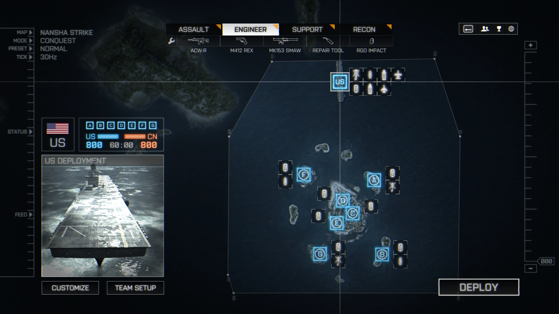 The first base is on the beach of E in conquest, near the landing pad. B is located in a concrete building, similar to the one on paracel storm at B that overlooks the water, and A is located in a trailer, similar to the ones on Rouge. The attackers get RHB's and an Attack Boat. A defense of anti vehicle infantry can make an assault on the beach nearly impossible, as without vehilcles the offense cannot get to the island easily.