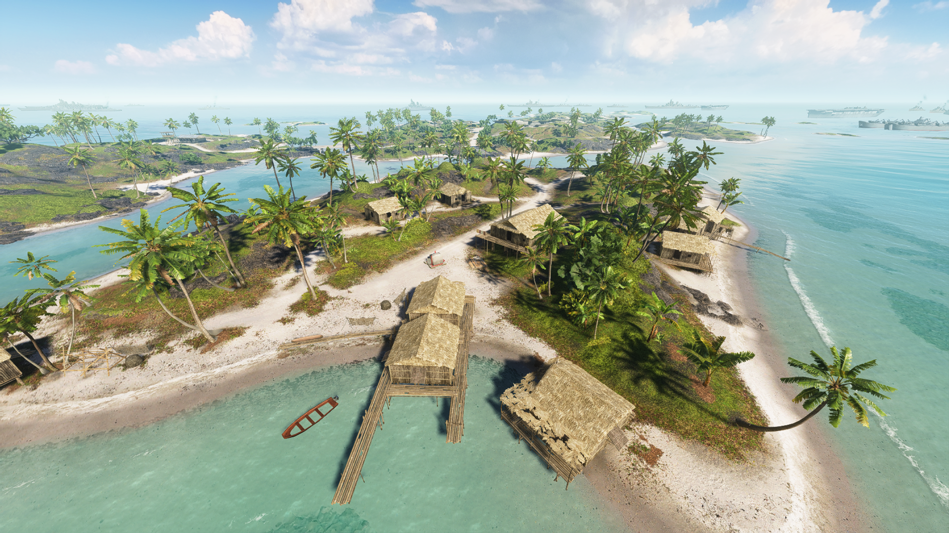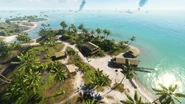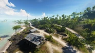 The Fishing Village (distinct from the two identically named objectives of Breakthrough and Squad Conquest, both found on Adawo) is located on Namuko Island. It is the singular point of interest on the island, which is itself one of the more isolated of the outer chain - it is connected by a single bridge on the north side of Atero, with no other crossing points except a ford immediately adjacent to the bridge. Despite this the civilian settlement is by far the largest of its kind within the archipelago, consisting of a nine huts dotted across the body and coast of the island, along with its own fishing pier. The capture zone, which is in itself the largest on the map, is focused on the house cluster surrounding the roadway in the island center, established into a sort of rudimentary cul-de-sac. Some of the houses are on stilts, and the terrain is almost bowl-shaped with open lower ground in the middle and on the north side of the settlement, and higher, more heavily vegetated ground at the edges. This variable terrain grants some concealment opportunities, although the houses offer the majority of available cover. In spite of this, they are easily destroyed by explosives, meaning the entire village can be flattened in the course of a round.