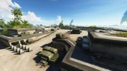 When captured, the flag spawns an amphibious tank by the roadway, as well as a dinghy in the shallows that the base overlooks to the west. Vehicle Repairs, Health and Ammo are provided by resupply points next to the first line defenses, while an M2 Flamethrower is found in one of the fighting positions of the second line.