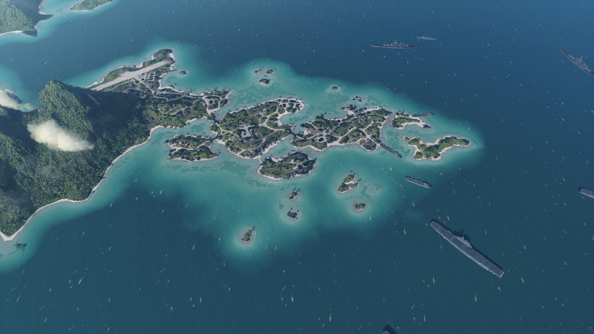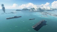 As US air power is exclusively carrier-based, the three Corsair F4Us are deployed from the flight decks of a trio of Yorktown-class Aircraft Carriers, aligned parallel to one another some distance out to sea to the west. The team's Aircraft Resupply Hook is located on the aft deck of the middle carrier.