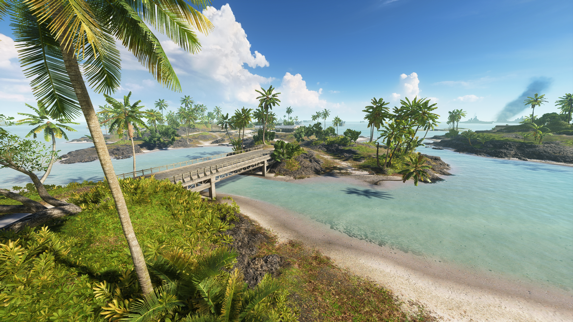 Conquest on Pacific Storm features seven flags, arranged in lines of two outer, three inner and another two outer flags. Some islands, like Adawo, Revo and Namuko, contain only one capture point and are separated by ocean, while on the islands that have two flags, said objectives are likely separated by difficult terrain and land obstacles. Despite this there is a large emphasis placed on vehicle gameplay. Tanks and aircraft have ample opportunities to make their presence felt on the battlefield - while the limited roads and crossing points can restrict mobility, the vehicles' ability to plough swathes through foliage, knock down trees, and tear apart structures, bridges and fortifications, can be of great assistance to those on foot, as can ordnance delivered by air. However, more so than any map, boats and amphibious tanks may prove decisive in shifting the frontlines. The ability to bypass terrain hurdles and stubbornly-held objectives by sea, seemingly at will due to the plentiful amount of Dinghies spawned by flags, can lead to a highly dynamic, unique match progression.