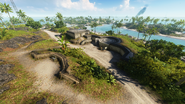 Similarly vast is the Japanese deployment area, which takes up much of the most easterly of the islands, Metene. The team has only one, land-based spawn, located halfway along the coastal highway between Radio Tower to the west and the Airfield to the east. This small outpost, which is comprised of two shacks and a supply shed on the edge of the jungle, is the spawn point for three Type 95 Kurogane, a 40mm Bofors gun and a Vehicle Resupply Station. The coast road is forked before and after the Outpost, with one path linking directly to Radio Tower and the other curving around a densely vegetated hill towards South Battery.