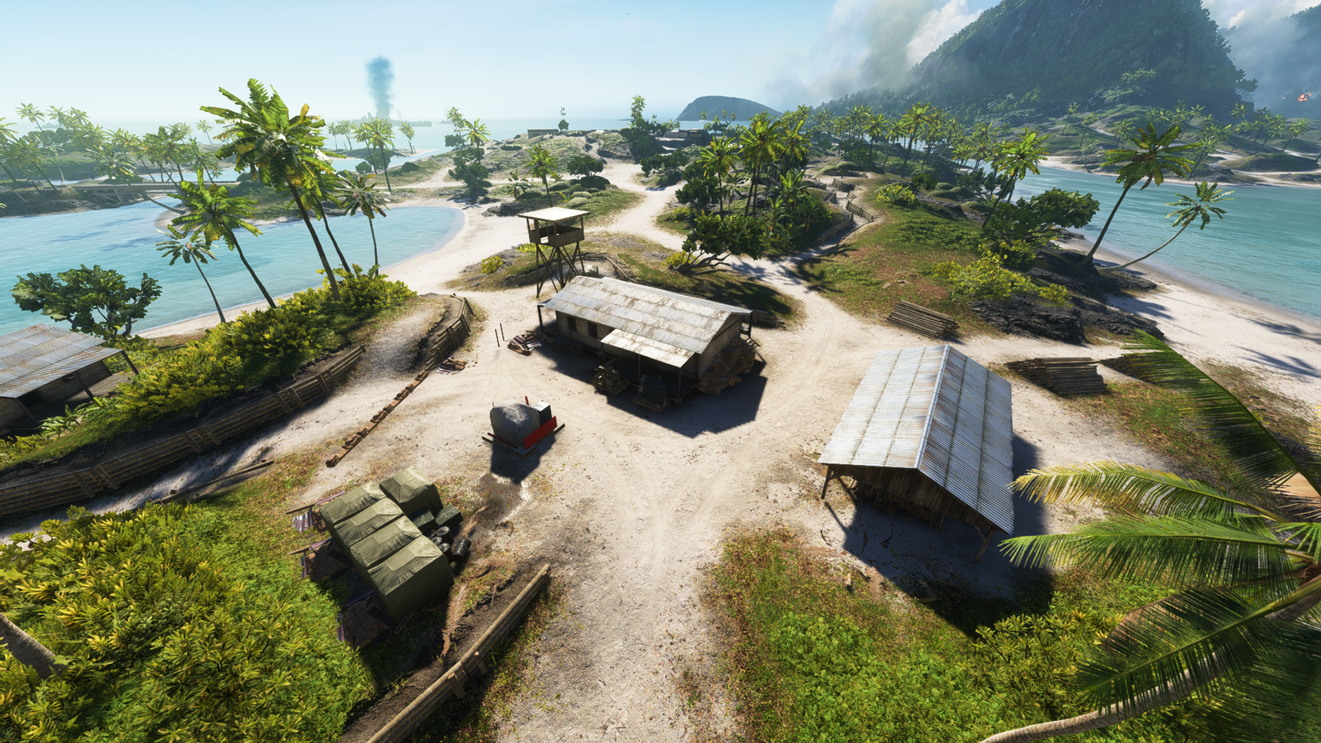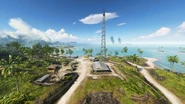 The larger of the two flags found on Metene Island, the Radio Tower is located on the thin, southern end of the landmass. The area consists of a communications outpost on a small hill, passed through by the coast road between the Airbase further inland and Fort May on the neighbouring Atero Island. The outpost is well fortified by a ring of trenches, barbed-wire fixtures and a log bunker around its south side, as well as a watchtower and 40mm AA gun position to the north. Inner of these areas either side of the main road is a series of supply tents and a single hut-type building, used as a command post. The Radio Tower stands on the east side, next to a small supply shed and a Vehicle Resupply Station. In spite of the relatively small capture zone, the compactness of the flag allows it to cover the interior of the entire base perimeter.