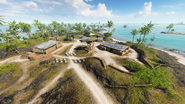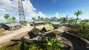 With a beachhead firmly established, the battle for Adawo continues on the far side of the island as teams fight over objective A, Bastion, and objective B, Forward Base. The Forward Base is directly north up the road from the Beach Camp. The fortified settlement has only one direct route in, defended by a pillbox, an anti-aircraft gun and housing a Vehicle Resupply Station, but can be flanked using the beach and jungle to its west and south, respectively, as a means for attacking forces to bypass the main body of defenses. Within the capture zone, which is large and includes most of the village structures, defensive cover is plentiful with players able to hide in and underneath buildings.