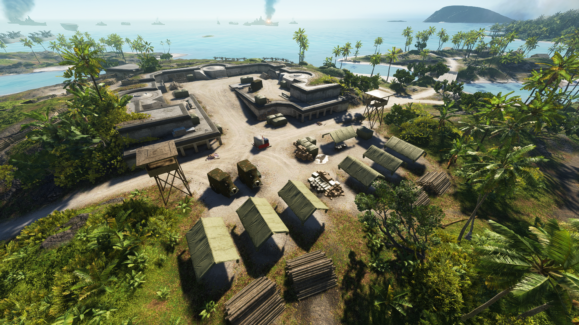 The last objectives to fall are at either end of the airfield. Northern Hill is located, fittingly, on the north side while the Air Wing Command is found opposite. Northern Hill appears as a smaller version of the Fort May Courtyard, with and outer line of trenches protecting an inner, below-ground bastion of concrete. The flag borders the mountainside to the north, and is defended by a number of wood and concrete pillboxes, a Type 10 artillery gun, and two 40mm AA guns. It is also quite close to the final Japanese deployment point uphill to the east, allowing them to counterattack quickly if the flag is threatened. The secondary objective of Air Wing Command is focused on a number of barracks buildings near Metene Island's south shore, bordering both the main road and the airstrip. The location is large than the Northern Hill, with the structures offering the majority of cover while they are still standing. The Air Traffic Control tower to the direct north gives defenders an unobstructed view of the main approach lines.