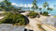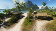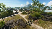 This flag's remote position lends itself well to defense, with the single road in and out covered by a 6 Pounder gun emplaced on a hillock on the southwest side of the island. As such, alike to the Officers Quarters, a seaborne attack on the beachside settlement may be more fruitful. In the Village near the stilt house is a Vehicle Repair Station, with a Katana battle pickup found inside the house itself. Health and Ammo are located across the road by the eastern houses. A Dinghy spawns by the pier on the northern tip of Namuko.