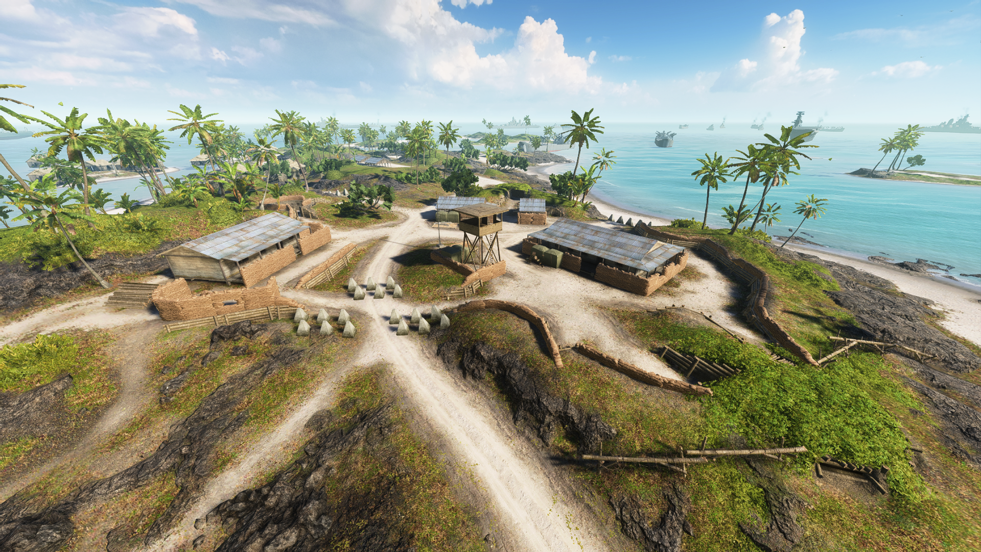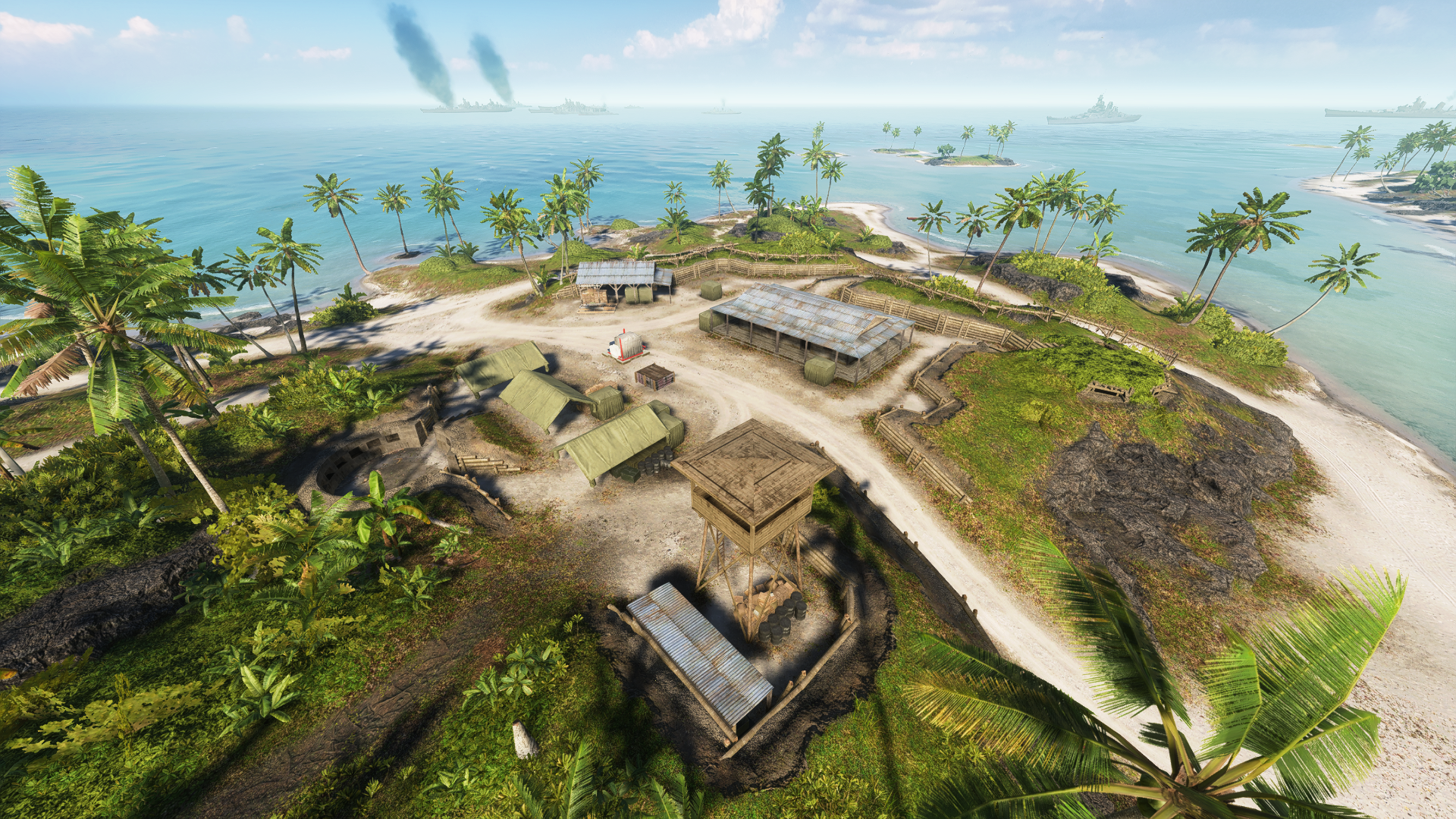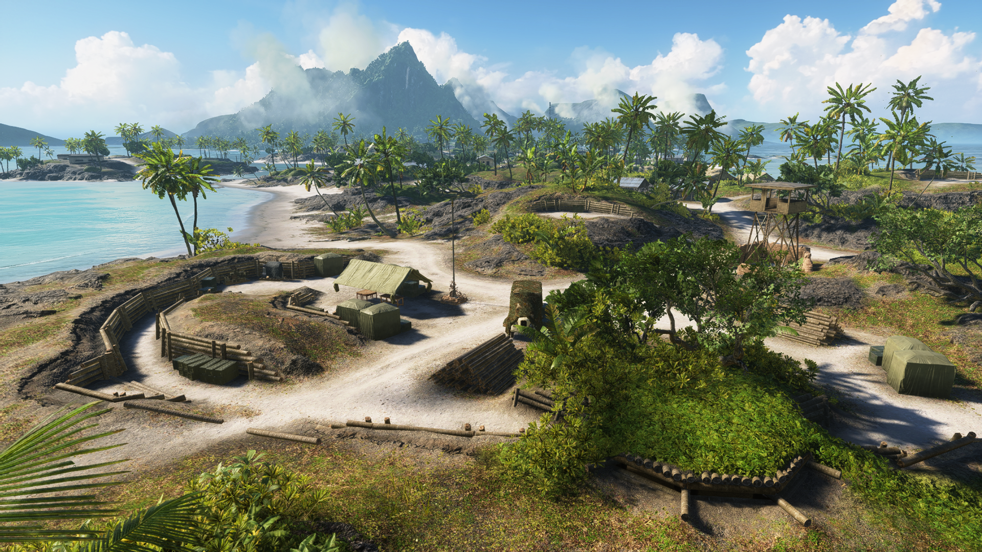 The first target of the Pacific assault is the outlying Adawo Island on the western end of the chain. One of the largest of the seven major landforms within the system, Adawo contains two objectives - the Beach Camp and the Fishing Village. The Beach Camp is, as the name suggests, near the beachfront on the northwest side of the island, and consists of a small ring of fortifications to defend the coast. The area is mostly open, watched over by a large hill and watchtower to the east. The Fishing Village is on the opposite coast of the island, where about a dozen stilt houses are grouped together on the shore and minor islands off the west coast. The actual objective site is further inland, concentrated on a band of log-wall fortifications set into a large hill, and is separated from the Beach Camp objective by a roadway through a rocky depression. The area is bordered by patches of dense foliage to the north and south.