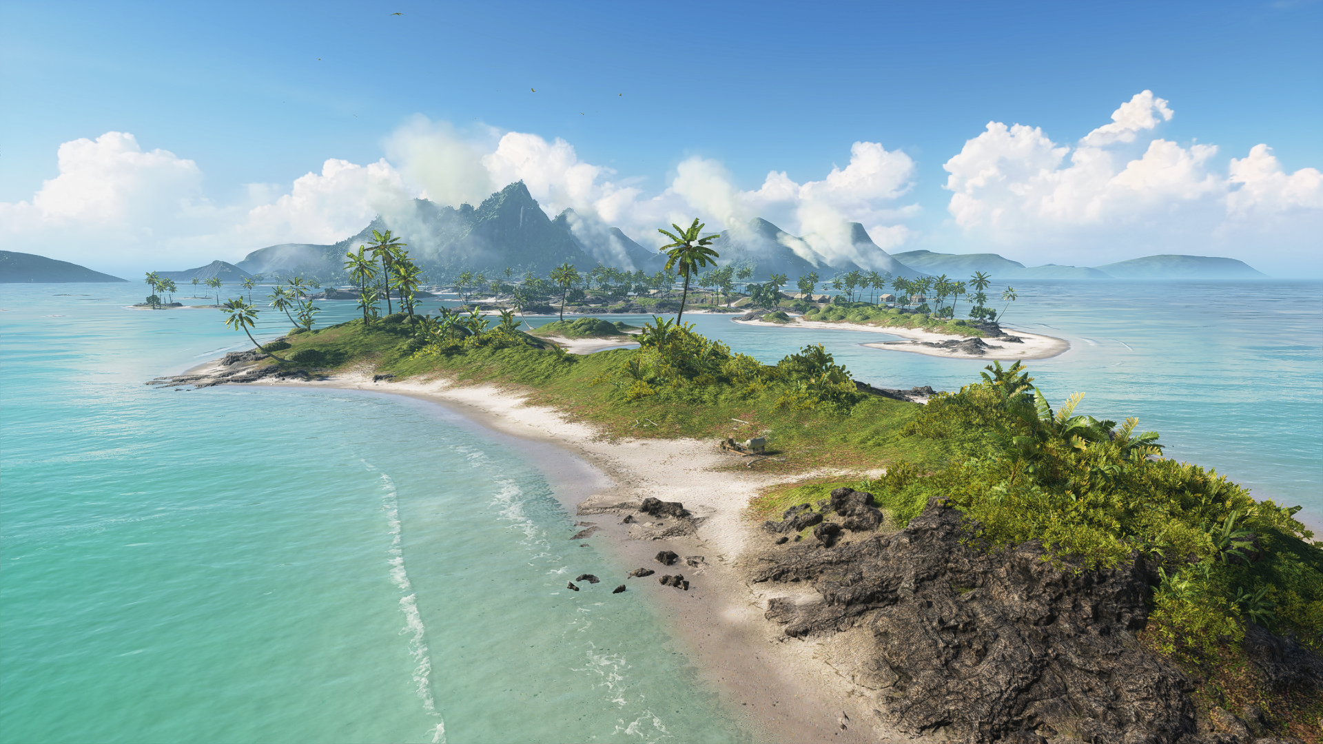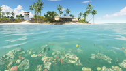 Standing in stark contrast to the bleak and desolate Iwo Jima, Pacific Storm is a lush tropical paradise of white sand, emerald grasslands and gleaming blue ocean. The land is a tangle of palm trees and dense thickets of vegetation, carved through by dirt roads linking together beachside hamlets of straw-roofed cabins, scattered fortifications and a small Japanese military base, all overlooked by a series of hazy mountain peaks in the distance. The area is teeming with life - the coast is a mosaic of coral reefs inhabited by sharks, manta rays and schools of colorful fish, while above the waves there is a cacophony of bird calls from seagulls and more exotic birds, circling overhead. However, the US armada on the horizon and dark clouds beyond are omens of two kinds of rapidly approaching storm.