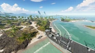 Downhill from the flag on the southwestern beach spawns a Dinghy. Health and Ammo containers are located within the same emplacement as the Type 10 on the northwestern side, while a Vehicle Supply Station is positioned on the road by the hill summit. An M2 Flamethrower can be retrieved from the northernmost pillbox.