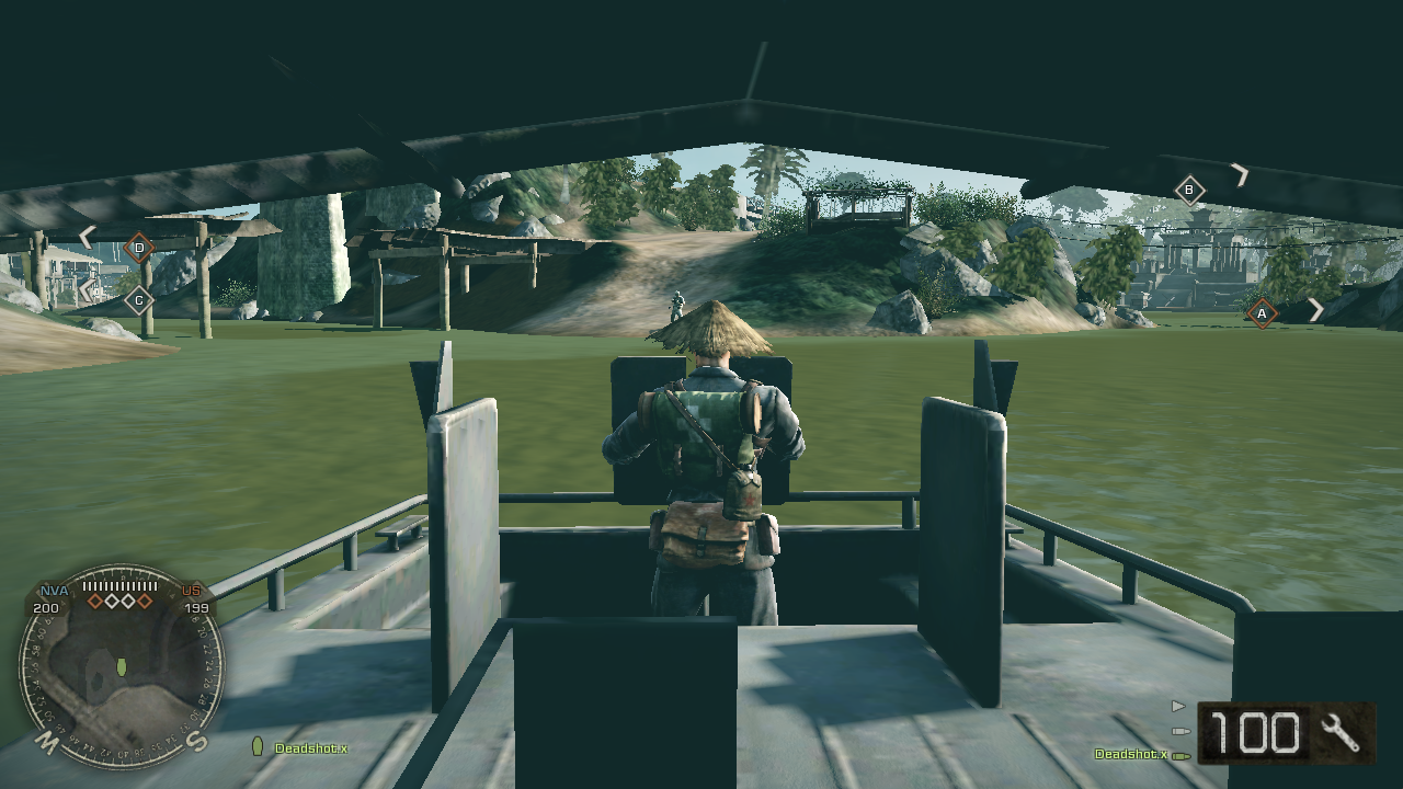 In Battlefield Vietnam, the PBR is issued to the United States Army, the United States Marine Corps and the Army of the Republic of Vietnam. It has space for three players: one driver and two gunners, one at the front with dual M2 Brownings, and the other at the rear with an M60, both with 400 rounds in reserve. It provides a fast way to maneuver across waterways, while providing limited protection for the players inside it. As with the Tango, it's possible to put a mortar on the boat by parachuting in and deploying a mortar just before touch-down, or by starting to deploy a mortar on a solid object, and jumping onto the PBR.