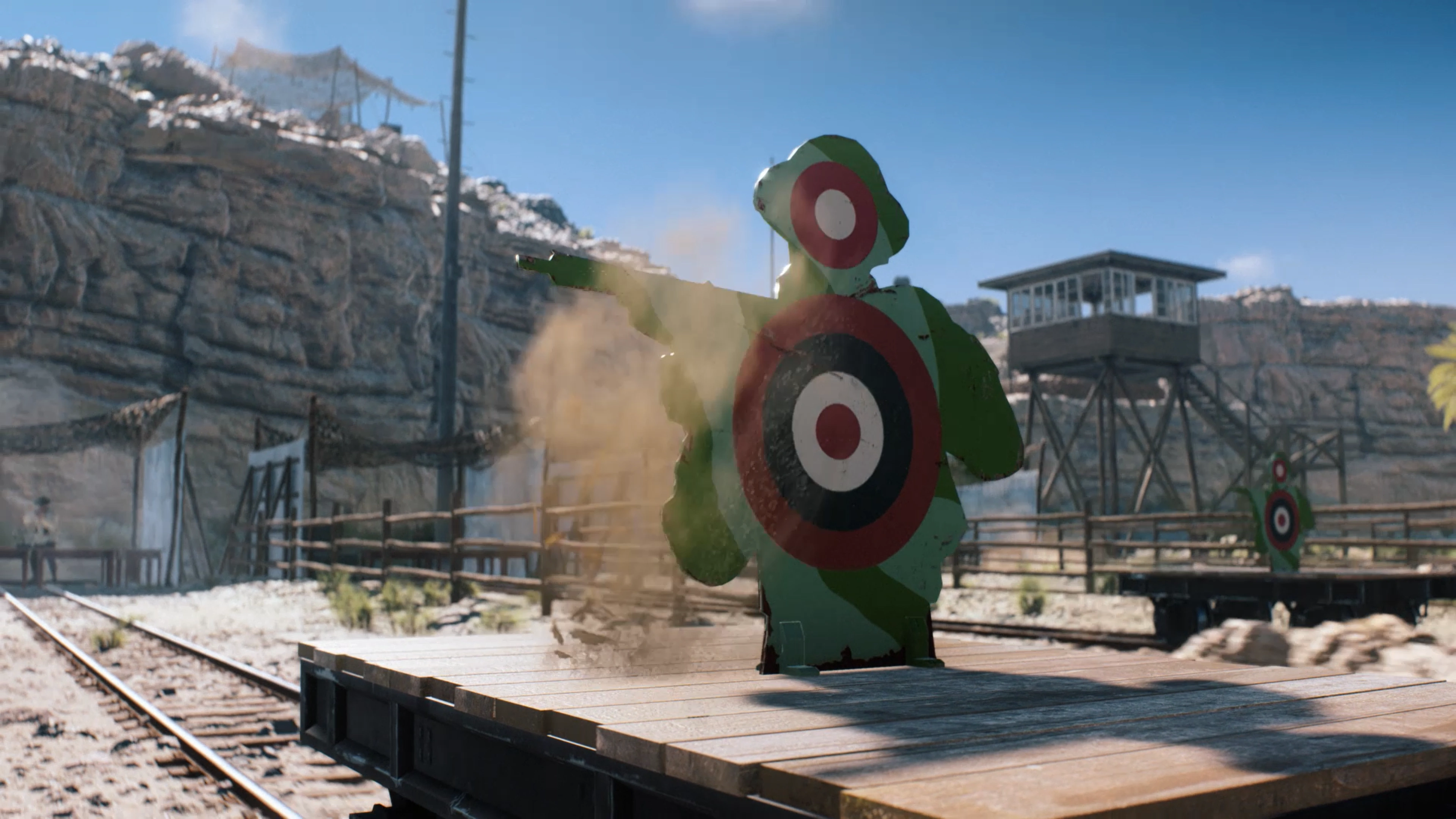 The Practice Range is a feature of Battlefield V, introduced on 5 December 2018[1] as part of Tides of War first chapter, Overture. Taking place on a version of Hamada, it allows players and squad up to 3 friends[2] to test weapons and vehicles without the possibility of being killed.[3]