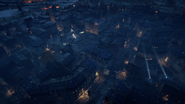 The streets are sparsely lit by lamposts, oil lanterns, and searchlights, although fires in the valley and artillery flashes illuminate the sky. Snow on the ground and icy windows suggest the battle takes place in early winter.